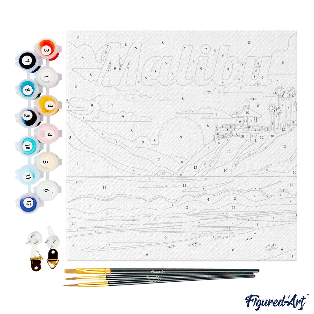 Model: Mini Paint by numbers Travel Poster Malibu 20x20cm already framed